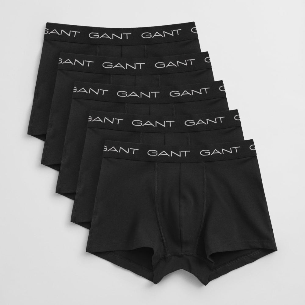 5-Pack Boxer Trunks, Black. GANT's underwear delivers supportive, comfortable fits in high-quality fabrics. These cotton stretch jersey trunks from GANT arrive in a 5-pack of classic, solid colors. They have a slim fit, regular waist and short leg length. Each trunk features a jacquard-knitted elastic waistband detailed with repeating GANT logos.