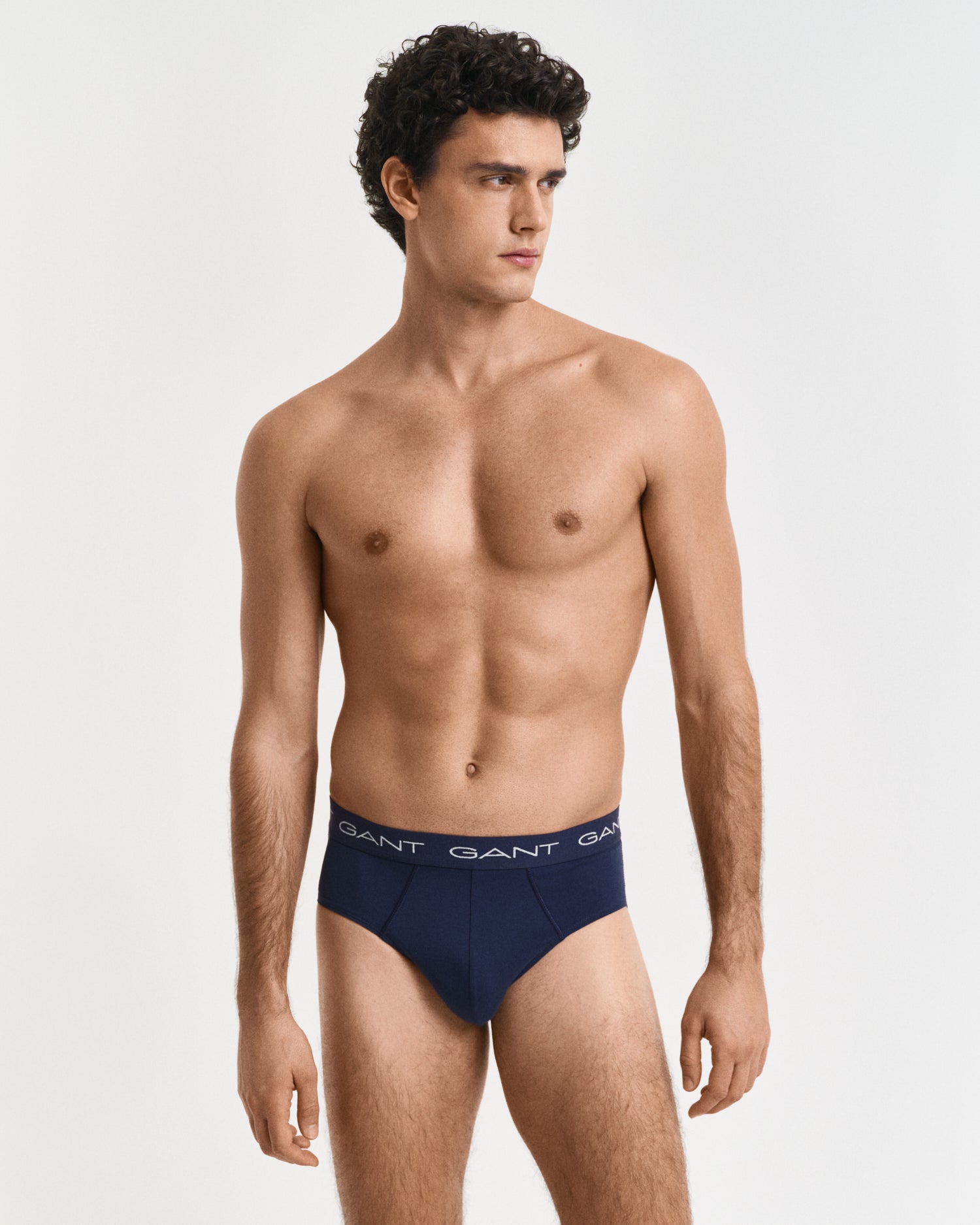 3-Pack Briefs, Marine. GANT's underwear delivers supportive, comfortable fits in high-quality fabrics. These cotton jersey briefs from GANT arrive in a 3-pack of classic, solid colors. They have a slim fit with a cut-out leg opening and a regular waist. Each brief features a jacquard-knitted elastic waistband detailed with repeating GANT logos