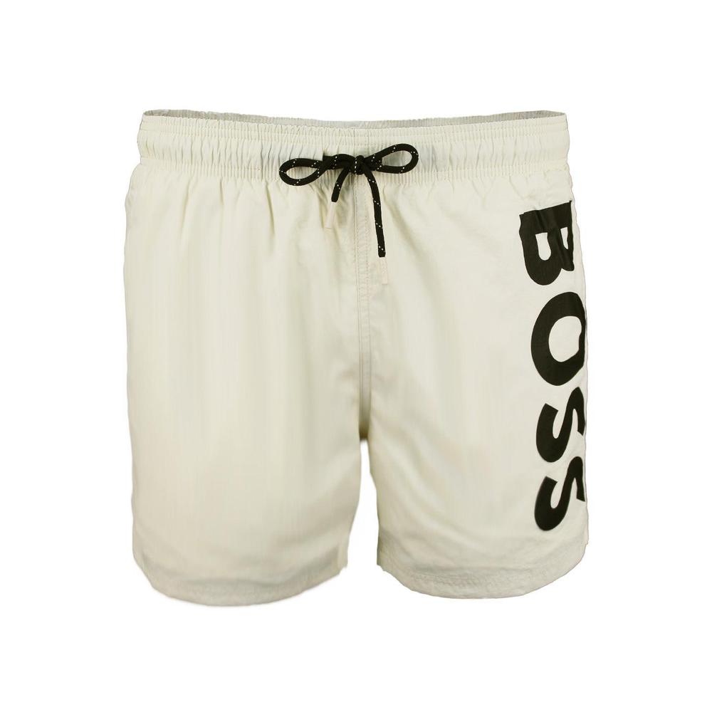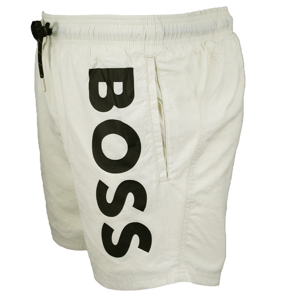 Boss Octopus Swim Shorts, Open White, by BOSS in quick-drying fabric with full lining and a vertical logo in contrast.