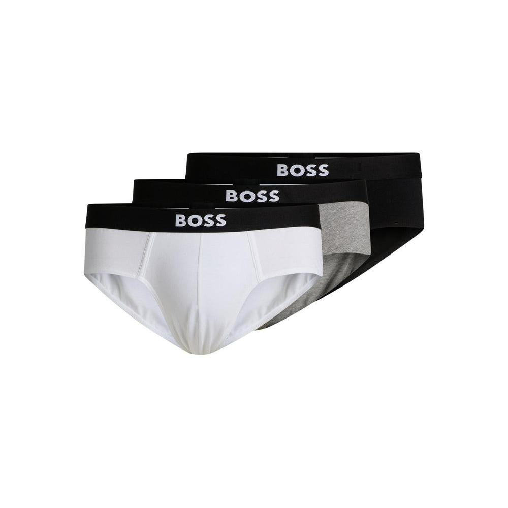 3-Pack BOSS ONE Briefs, Black/Grey/White. Upgrade your everyday foundations with this three-pack of BOSS Menswear briefs. Crafted in comfortable stretch-cotton jersey. Low-rise waistband featuring contrast branding. As seen on David Beckham in the new BOSS ONE underwear/bodywear campaign