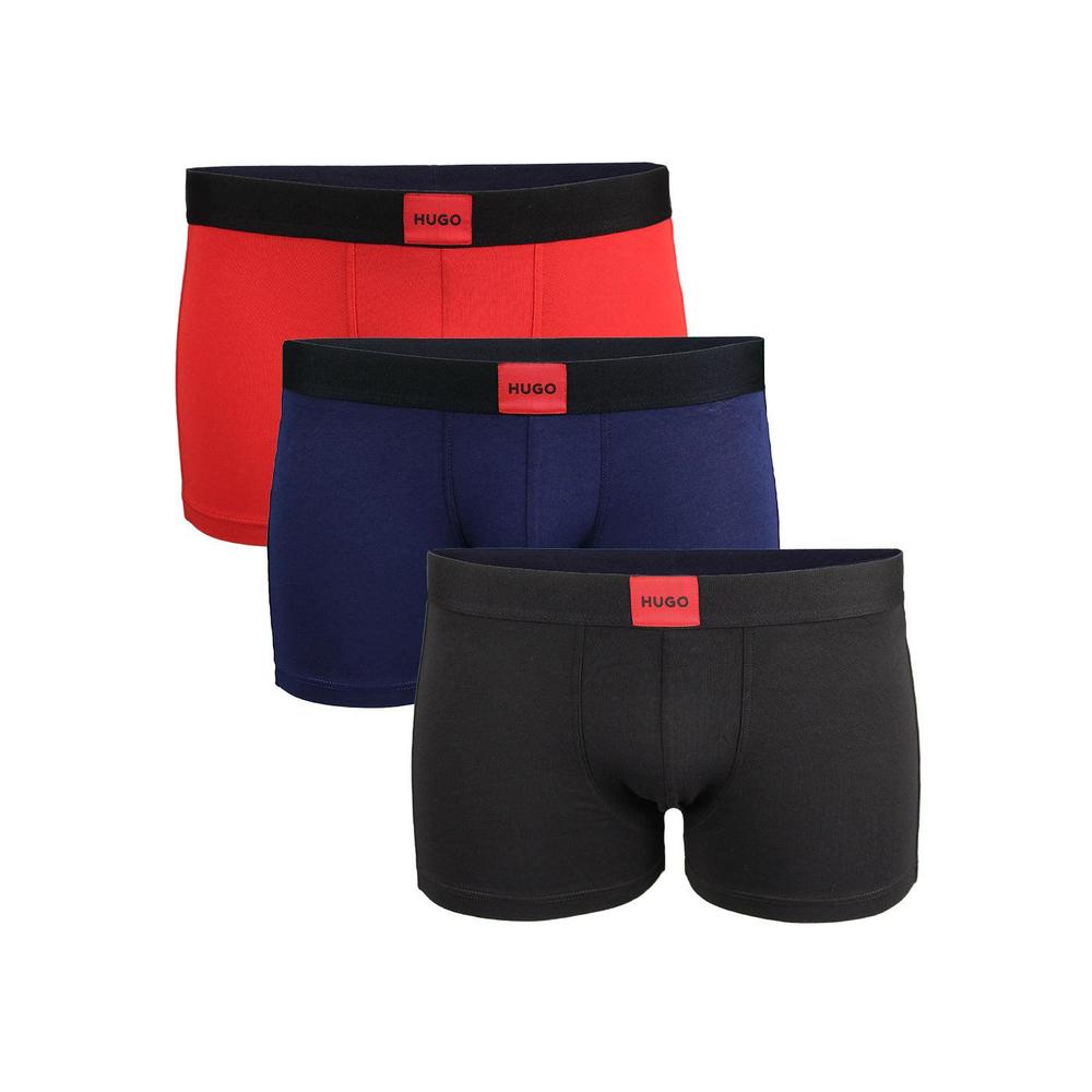 HUGO 3-Pack Logo Patch Boxer Trunks, Black/Blue/Red. Essential trunks by HUGO Menswear, crafted in stretch-cotton jersey for everyday comfort and ease of movement. Regular-rise waist with HUGO logo patch.