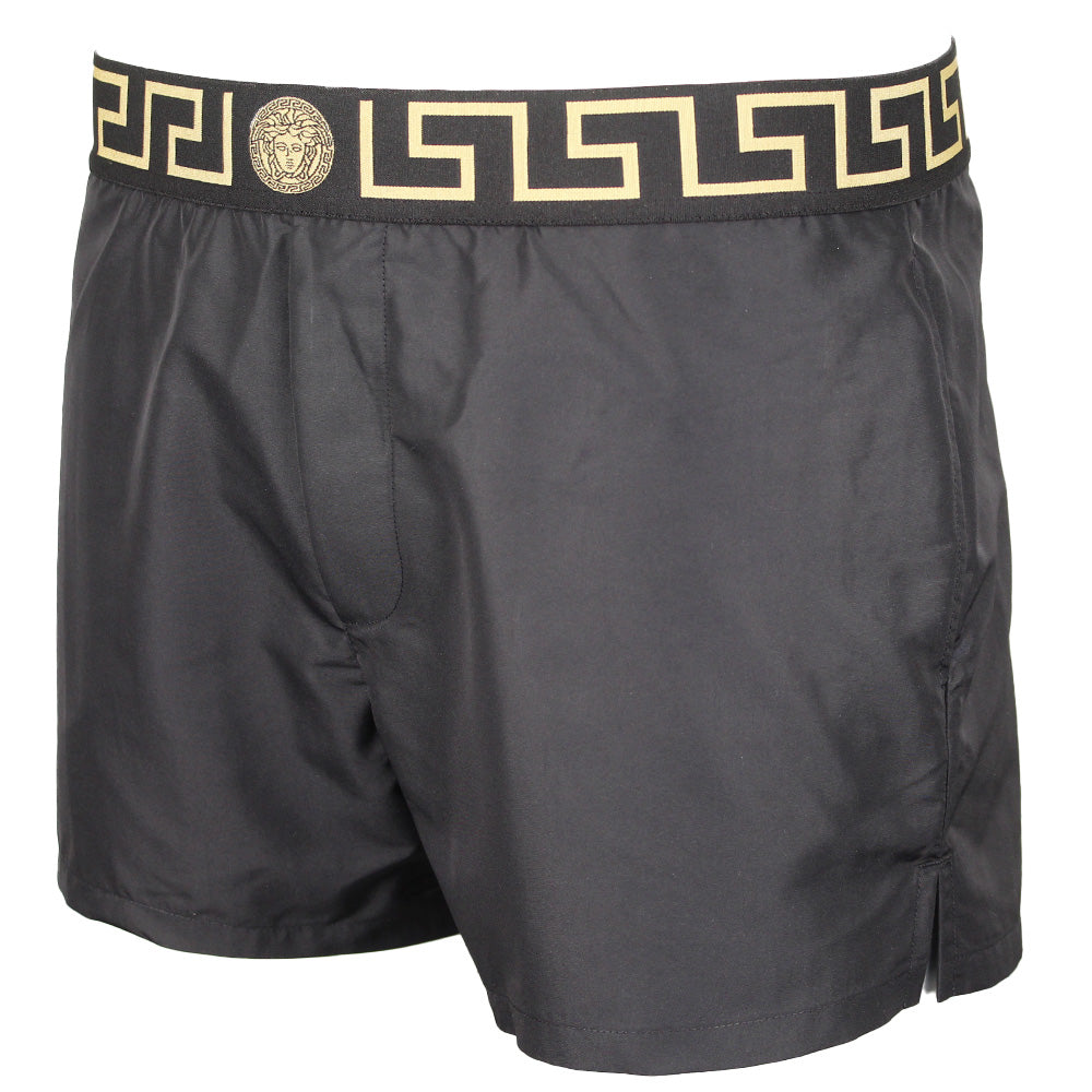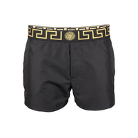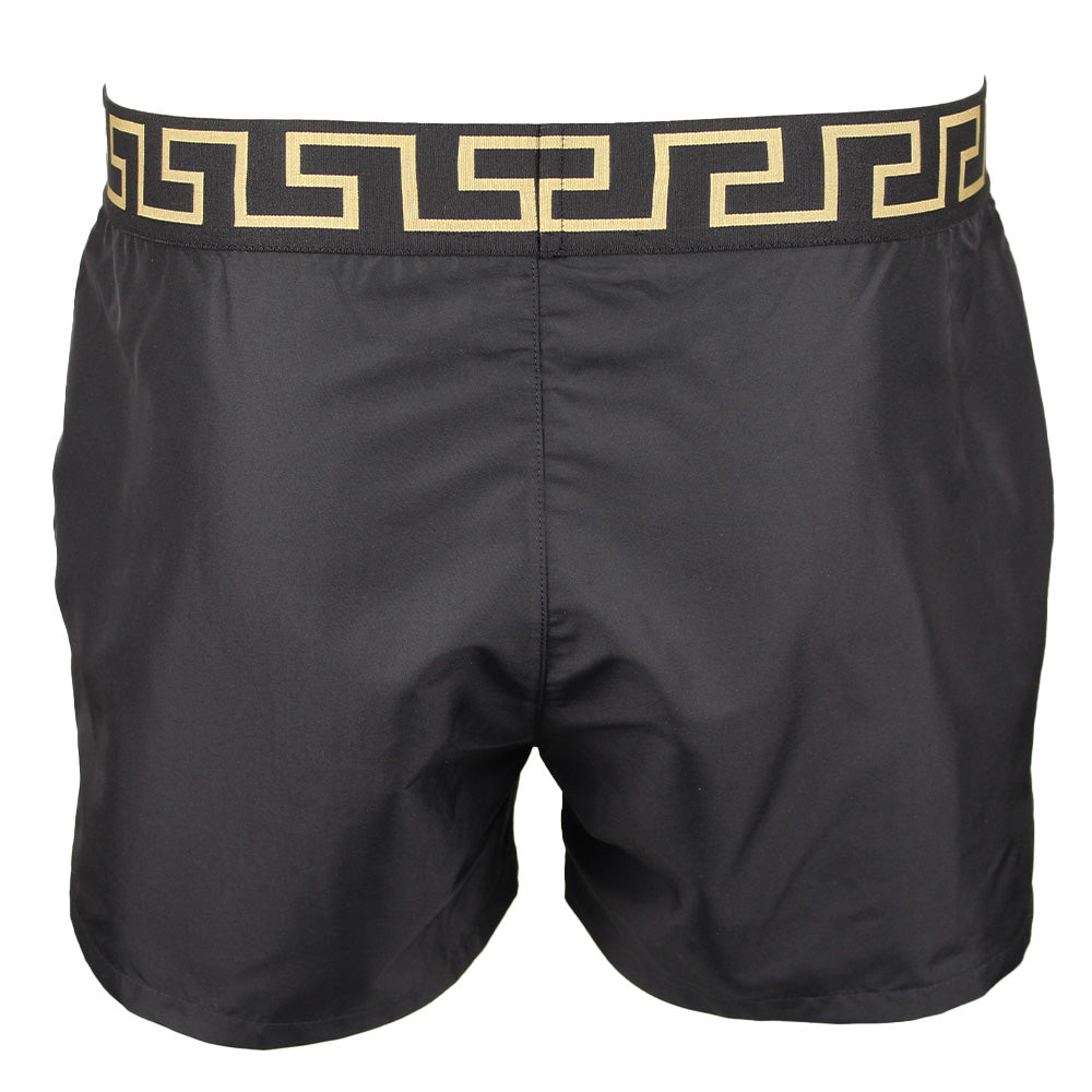 These swim shorts feature the Greca border with a central Medusa motif on the elastic waistband.