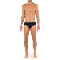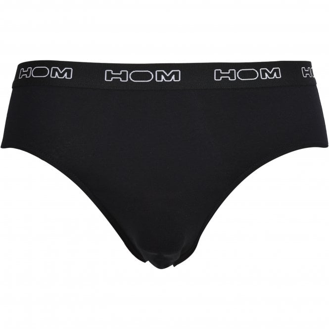 The cut of these briefs is a "classic" shape of briefs at HOM. This shape emphasizes the curvature of the hip and gives a finely retro look to the underwear. On the black belt, the HOM logo is presented in white contrast. The elastic band remains soft on the inside and does not compress thanks to the flexibility of the microfiber of which it is composed. In terms of finishes, elastics and assembly seams, the briefs are designed to ensure a good fit on the body without unpleasant compression on the skin.