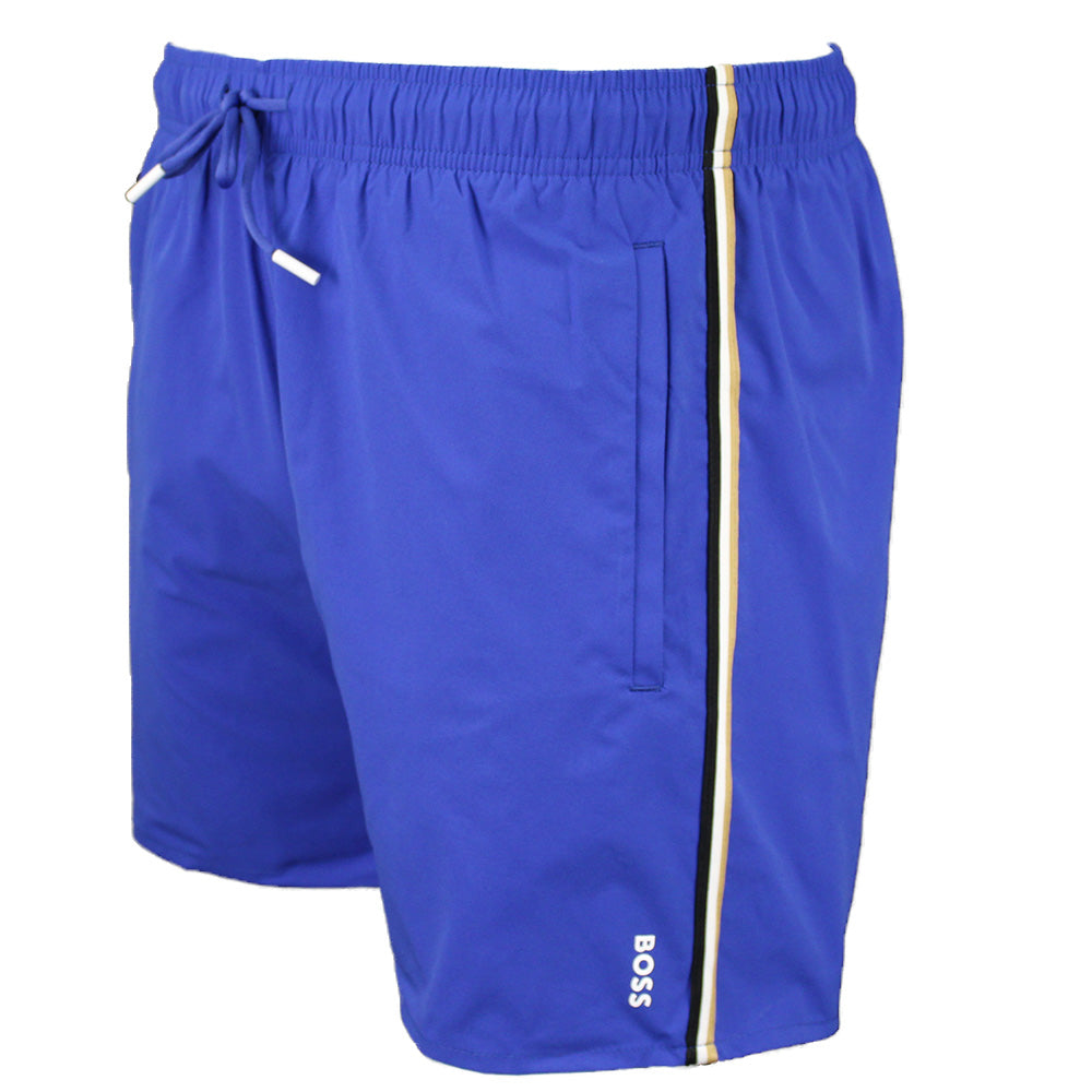 Boss Iconic Swim Shorts, Medium Blue. Swim shorts with signature stripe and logo.