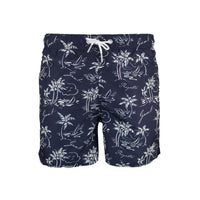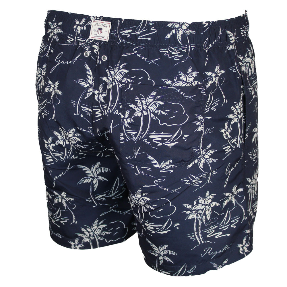 GANT Island Print Swim Shorts, Evening Blue. Crafted from 100% recycled polyester, these swim shorts from GANT are essential for the summer season. Cut for a regular fit, they have a mid-thigh length and a regular waist.