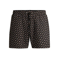 BOSS Manu New Swim Shorts, Black. Signature-trim swim shorts by BOSS, crafted in fully lined quick-dry fabric printed all over with monograms for a distinctive look. This product is partly created with recycled polyester.