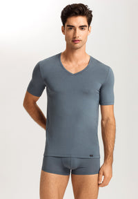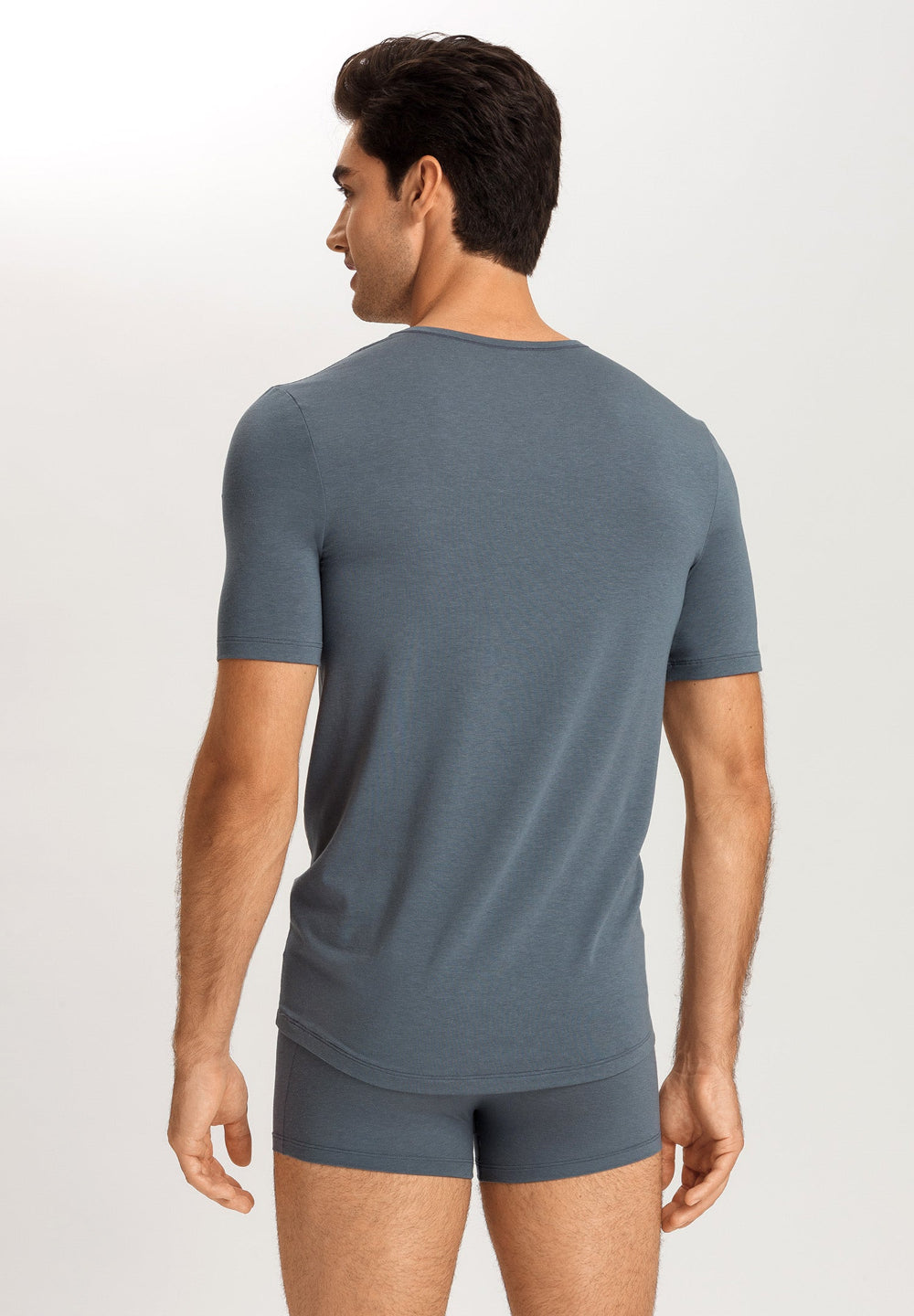 HANRO Natural Function V-Neck T-Shirt, Black Clay. This short sleeve V-neck t-shirt in black clay is made from an ideal blend of sustainable TENCEL™ Lyocell fibers and high-quality cotton. This makes the top breathable, extremely comfortable, kind to the skin, with high moisture absorption.