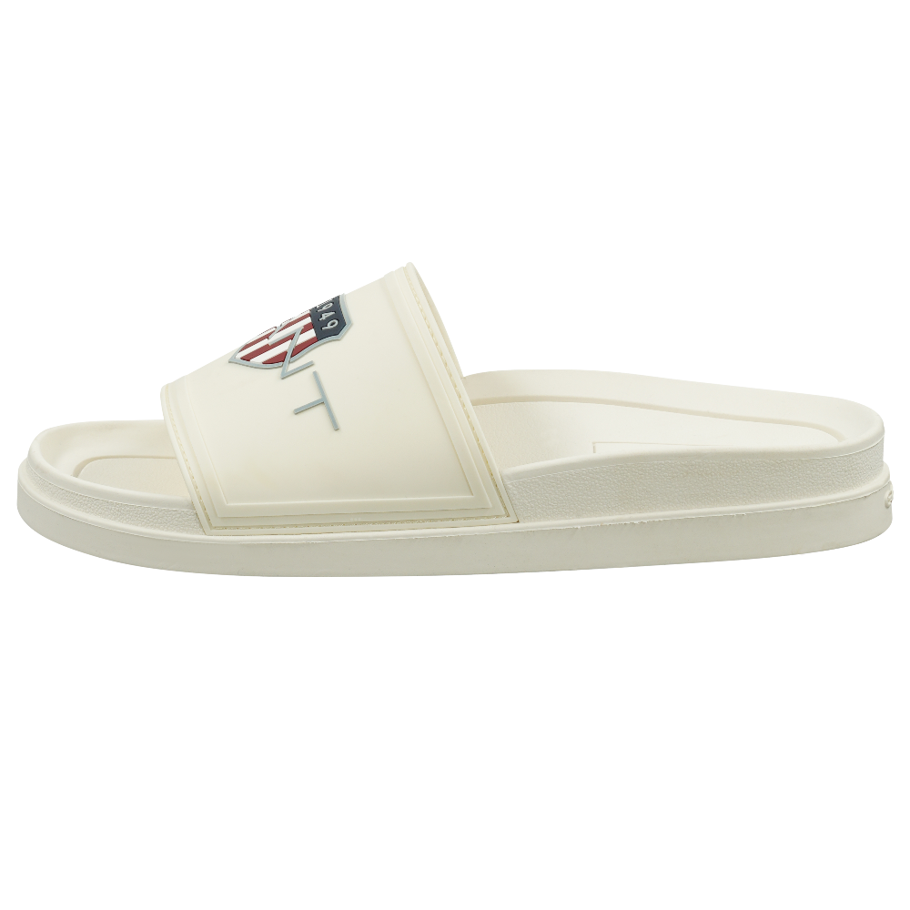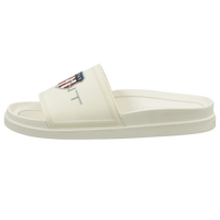 GANT Pierbay Sliders, White. Synthetic outer with lightweight EVA sole. Memory cushioned footbed and Archive Shield Graphic on upper strap.