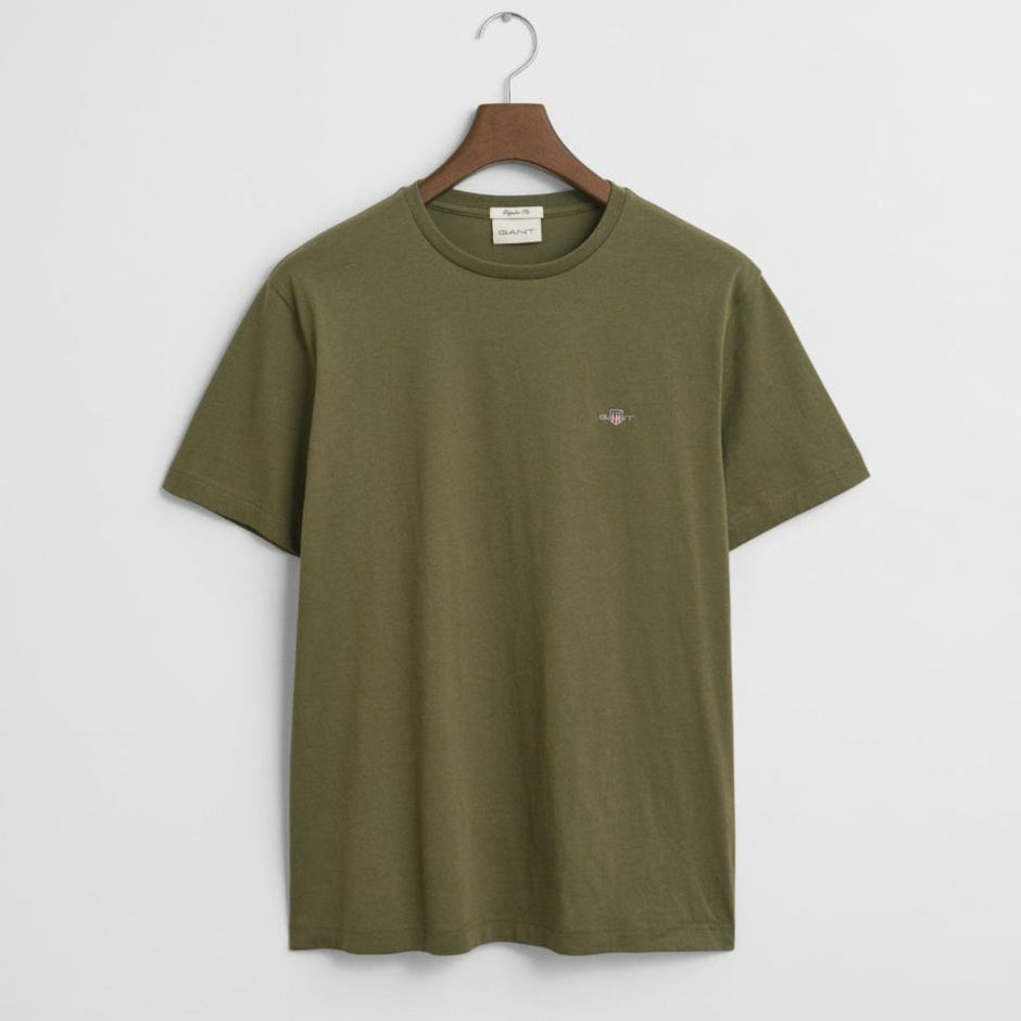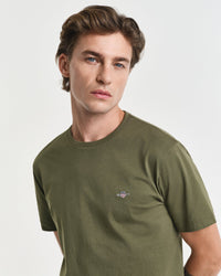 GANT Regular Shield T-Shirt in Moss Green. Featuring a small-scale shield graphic embroidered at the chest, this T-shirt is crafted from cotton with a fine rib at the neckline for ultimate comfort.