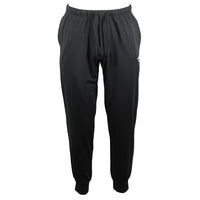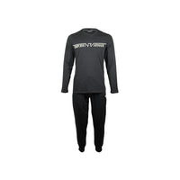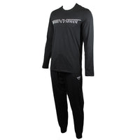 A stretch-cotton men's pyjama set in black. Perfect for colder nights and for lounging around the house. This set features a long sleeve top with new season branding across the chest. The matching bottoms are cuffed with an adjustable drawstring waist.