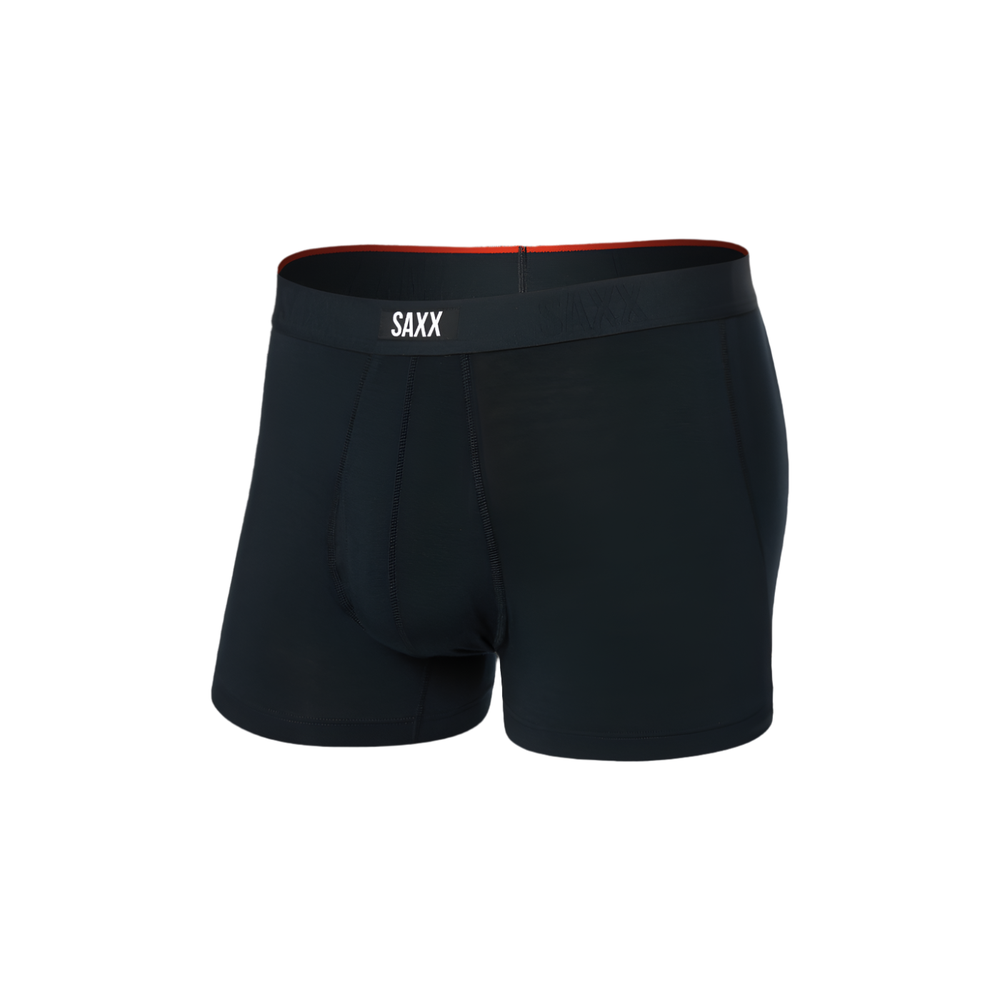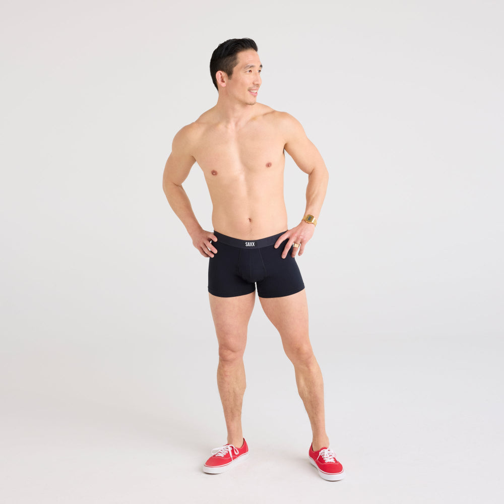 Vibe Xtra Super Soft boxer trunks by SAXX in solid black. All men deal with the last drop. Gentlemen do something about it. Quit the post-pee shaking and dancing and upgrade to Vibe Xtra with Stop Drop Technology™. Made with the same super-soft material as the OG Vibe, SAXX have integrated a wicking fabric structure into this pair’s pouch to deal with those awkward visible dribbles. Features a fly and 3" No Ride Up Leg.